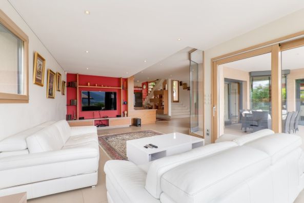 Superb 220m2 house with lake and mountain views Annecy NordANNECY SOTHEBY'S INTERNATIONAL REALTY offers you this magnificent architect-designed villa built in 2012, located in a privileged environment in the Annecy Nord conurbation and 30 minutes from Geneva (direct access to the A41). Set on a plot of 1550m2, this sublime 220m2 villa comprises 162m2 of living space and a 58m2 habitable annexe. This south-facing villa combines a contemporary feel with every comfort and an exceptional panoramic view overlooking Lake Annecy and its mountains. The 109m2 first floor comprises a beautiful, light-filled living room, a bright dining room with a fully-equipped kitchen, an adjoining storeroom, a spacious study and a guest toilet. This living area is bathed in light thanks to its large bay windows giving access to a splendid 135m2 terrace and heated 10mx4.5m swimming pool with counter-current and massage jets. The verdant grounds also feature a vegetable garden and a small orchard. The first floor comprises three bedrooms, two of which have private access to their own 50m2 terrace overlooking the pool, lake and mountains. The master bedroom has a spacious bathroom (walk-in shower and whirlpool bath) and dressing room, and the two other bedrooms have a shower room and separate toilet. Double garage (35m2) and off-street parking for 4-5 cars. Independent studio of 25m2 with shower and toilet for entertaining. Spacious utility room and wine cellar. Heat pump supplying the villa and swimming pool, underfloor heating and central vacuum extraction. ANNECY SOTHEBY'S INTERNATIONAL REALTY, your expert in the sale and rental of luxury properties in the Annécien and Aravis areas. Energy and climate performance Estimated amount of annual energy expenditure for standard use: between 2120€ and 2930€