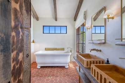 La propriété Lo Scoglio, située à Coopers Shoot près de Byron Bay, en Australie, en est une illustration particulièrement aboutie. Inspirée des masserias siciliennes, elle associe murs en pierre calcaire travaillés à la main, sols en bois ancien, finitions en terre cuite et détails en laiton sourcés auprès de Tigmi Trading.