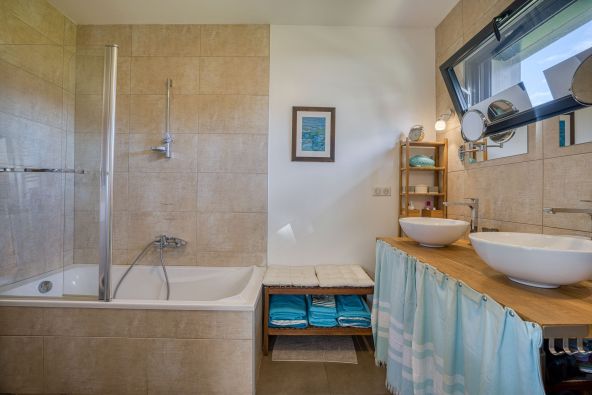 La maison dispose de 5 chambres, dont une suite parentale ouvrant sur une terrasse avec jacuzzi. Un bureau complète le rez-de-chaussée. L’espace de vie ouvert de 75 m², comprenant séjour et cuisine, s’ouvre sur la terrasse et le jardin aménagé et clôturé.