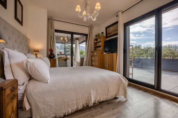 Un appartement indépendant, avec cuisine et chambre, est aménagé au sous-sol et bénéficie d’un accès extérieur privatif. Un garage fermé avec prise rechrge eléctrique, un carport et des places de stationnement extérieures sont également disponibles.