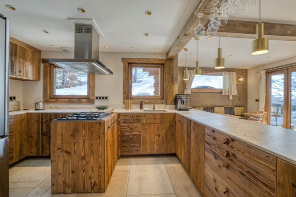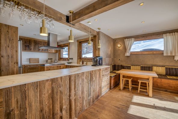 Le chalet se compose d’un appartement au rez-de-chaussée avec deux chambres, deux salles d’eau avec WC, une kitchenette équipée avec coin montagne et un ski-room. À l’étage, le séjour de 50 m² avec cuisine américaine entièrement équipée dessert deux chambres avec leur salle d’eau et WC, ainsi qu’un accès au grand jacuzzi. Le séjour s’ouvre sur une terrasse de 57 m². Sous le toit, une suite complète avec salle d’eau et WC.